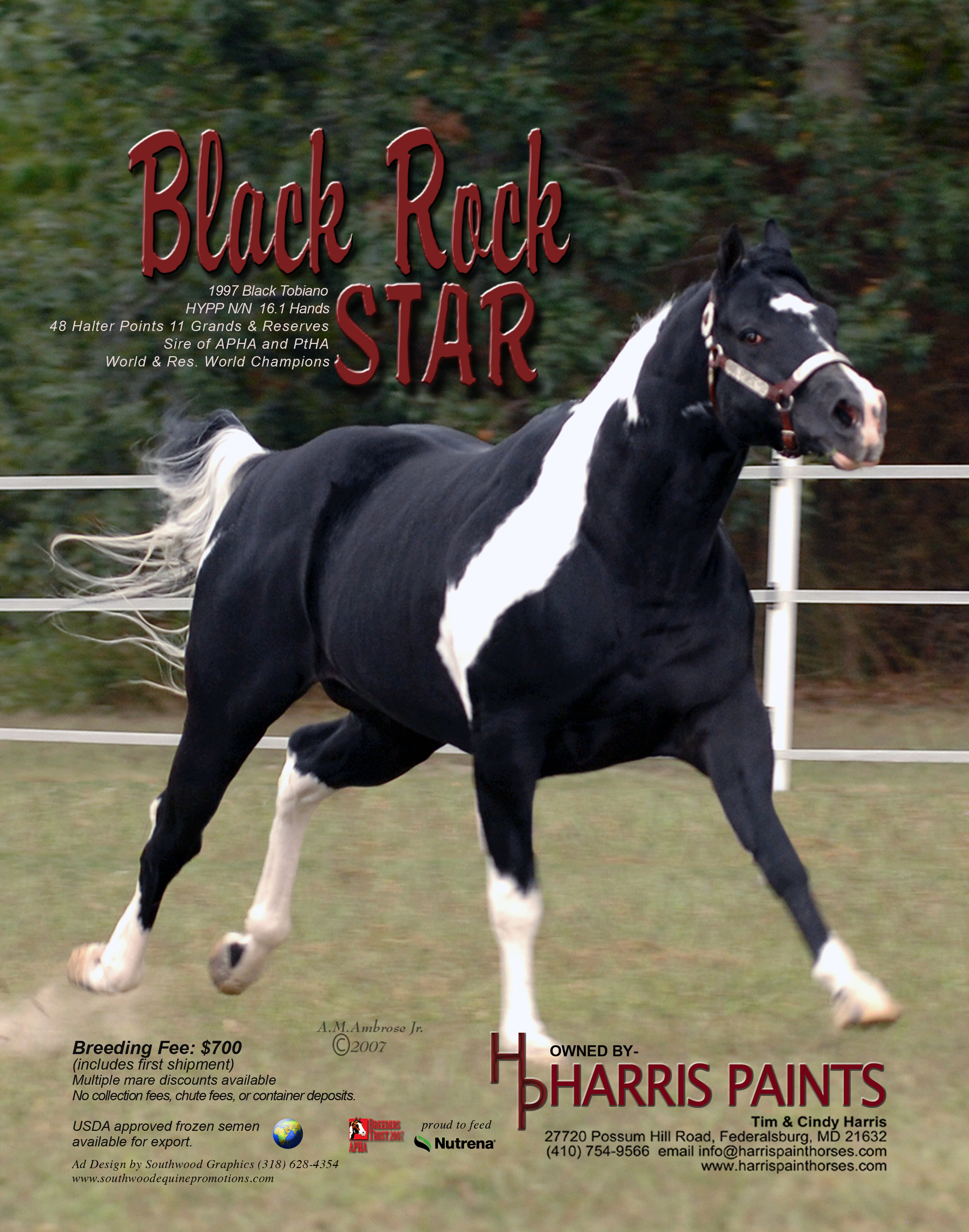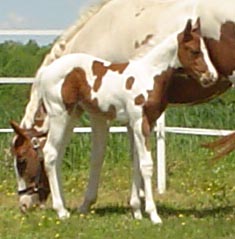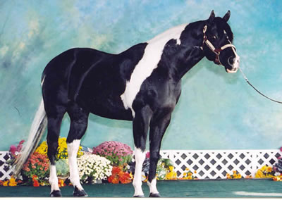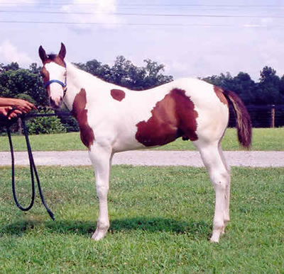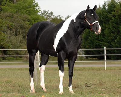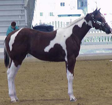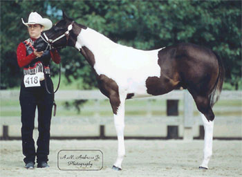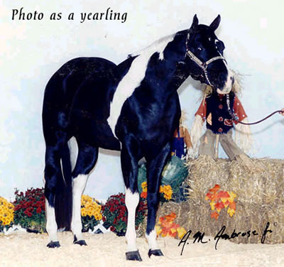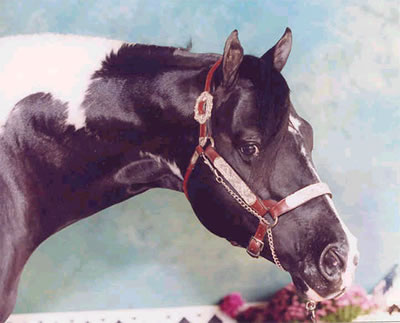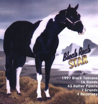 Sired by: Ole Patche Rock, Black Tobiano. APHA ROM earner in Western Pleasure (17 points), earner of 2 APHA halter points, 4 APHA Am. Halter Points, 1 APHA Am. Hunter Under Saddle Point, PtHA Register of Excellence in Halter and Color, 1998 PtHA National Halter Champion, 3rd at 1997 APHA World Show, Tobiano Color Class. Sire of APHA and PtHA Futurity winners, APHA Point earners and Pinto Champions.