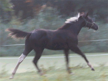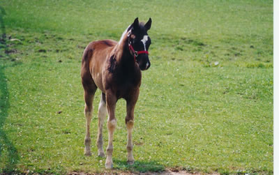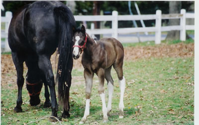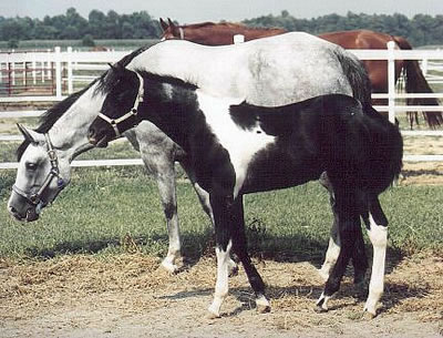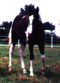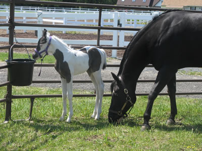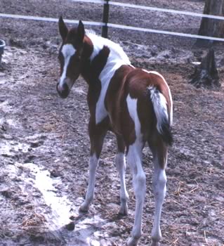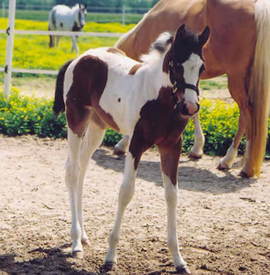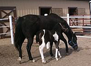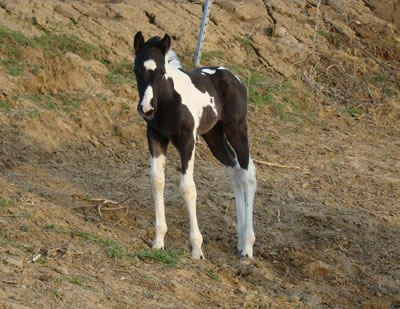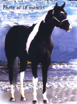 Rocky Hughes (Black Rock Star x Sarah Hughes). 2003 black tobiano colt. Photo at 4 1/2 months. Multiple Futurity winner and halter point earner