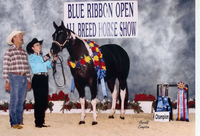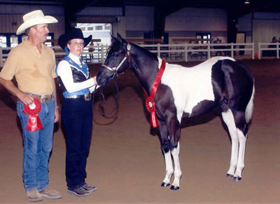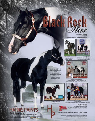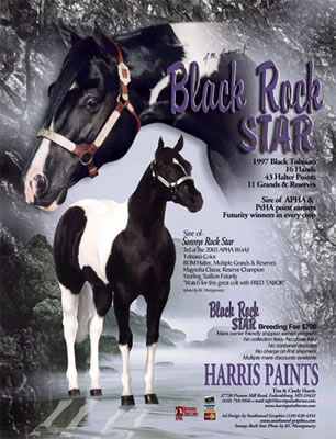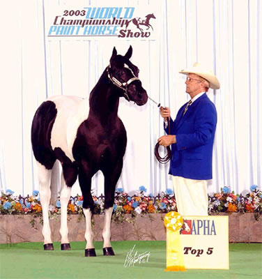 CONGRATULATIONS TO SONNYS ROCK STAR! on winning Res. World Champion at the 2004 APHA World Show AND the Res. World Champion at the 2004 PtHA World Show. 2002 Black Tobiano colt. Winner of over $650 in futurity earnings. 2nd (tied for 1st, but lost under the tie breaker judge) in both the SPHC Late Colt Breeder's futurity and in the SPHC Late Colt Open Futurity. 3RD AT THE 2003 APHA WORLD SHOW.