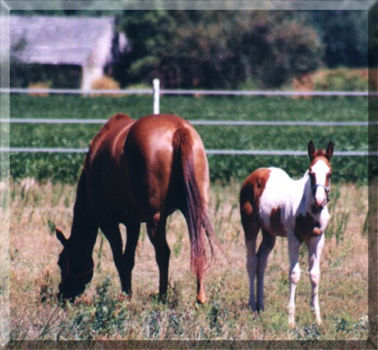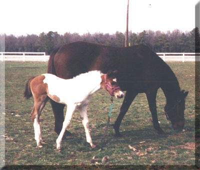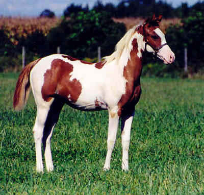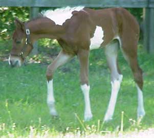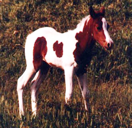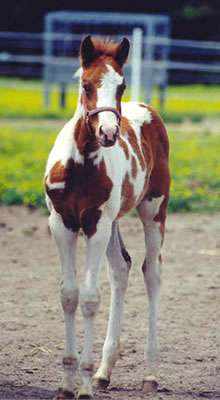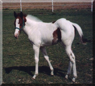 Heza Lucky Lover 1998 Sorrel Tobiano Colt by Lucky Two Straws and out of Sheza Cajun Lover (AQHA). Photo taken at 30 days.