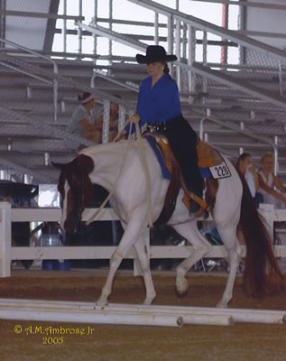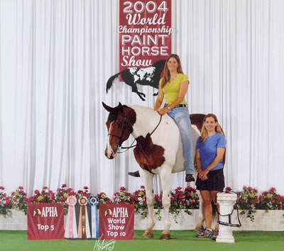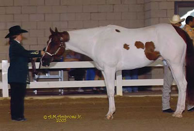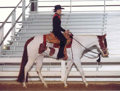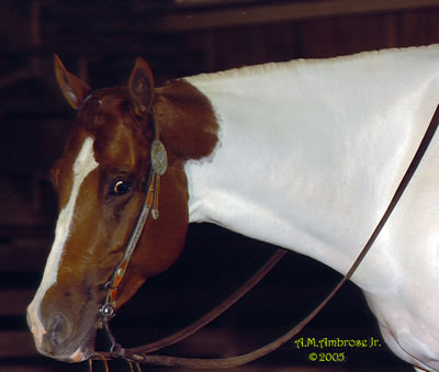 O What Luck - 1989 sorrel Tobiano. APHA Champion, Earner of 384 Points with 10 Register of Merits and 3 Superiors. APHA Versatility Award Earner. Our sympathies to owner, Taunie Lewis (and family), who lost this great gelding in a cougar attack. "Lucky" was Taunie's youth horse and as she described him, her "horse of a lifetime."