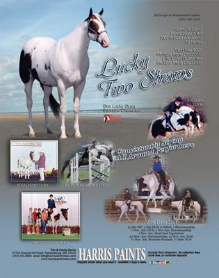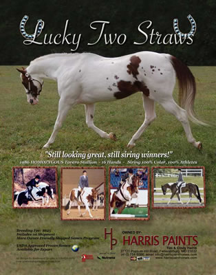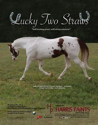 Lucky Two Straws has also been crossed successfully on TB, warmblood and draft mares for the Sport Horse market as well as Arabian mares for Half Arabian Pintos.